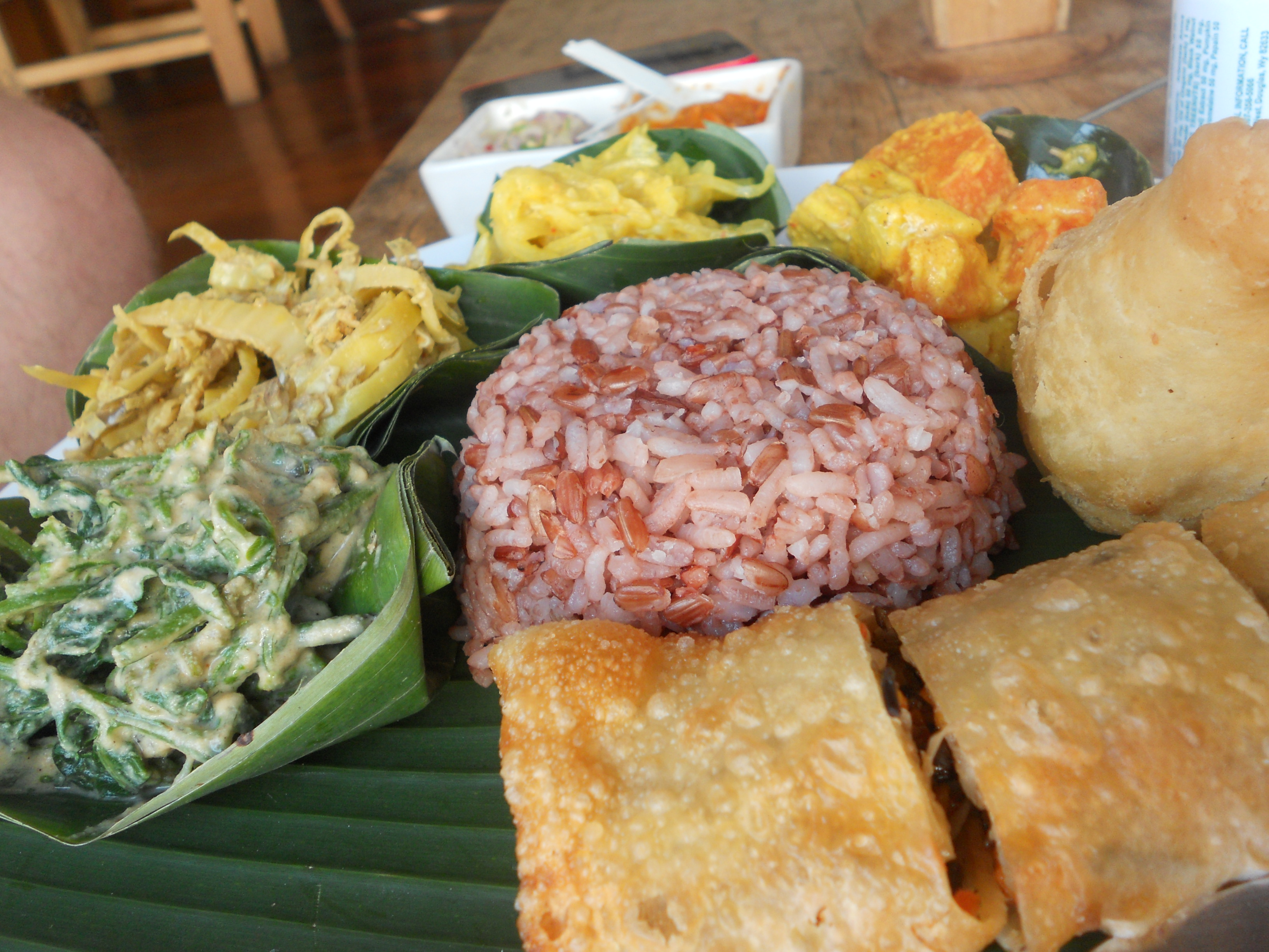 I tried the nasi campur, which was labeled vegan and gluten-free. It was delicious and seemed very traditional Balinese cuisine, served on a banana leaf. There was a mountain of brown rice and spicy sombal coated tempeh and tofu. With a green bean, water spinach, and sprouted vegetable dish (this was really tasty since it has some toasted coconut mixed in… both savory and sweet) and some tempeh and tofu kabobs. They have a great selection of juices too. I had the carrot, apple and parsley blend. Our next stop is Seminyak, Bali which apparently has lots of vegan and gluten-free options. More to come!!!